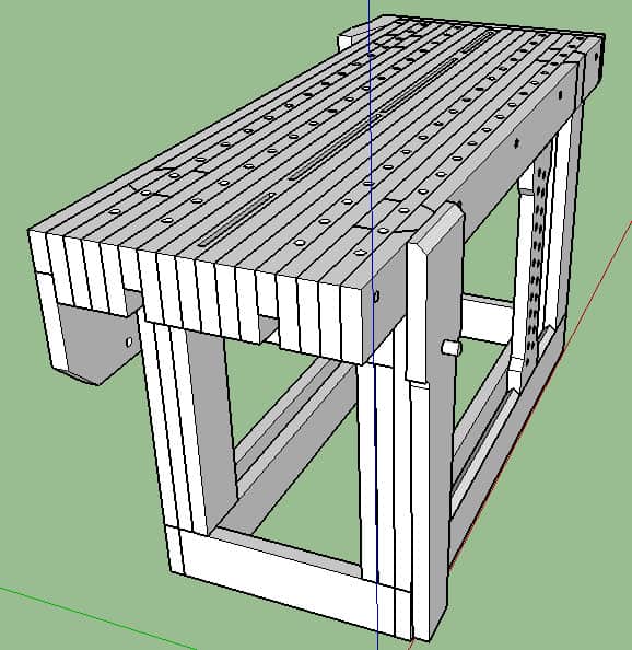 Since it will be used mostly for assembly and hand-tool work, it needs good work-securing options. Probably holdfasts, dogs, and both a leg vise and end vise.